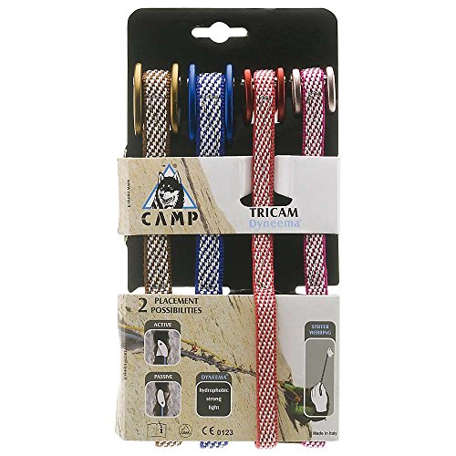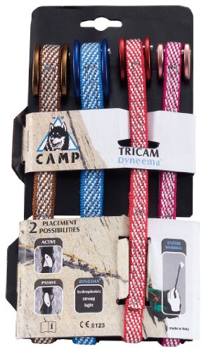 Studio : Camp Usa Publisher : Camp Usa Product Description FEATURES of the Camp USA Dyneema Tricam Set Two Placement Modes: active cam and passive chock Works where nothing else can fit, such as solution pockets Excellent in horizontal cracks Stiffer sewing on the slings for easier one-handed placement and extraction Compared to nylon, Dyneema maintains a higher breaking strength when wet and its natural hydrophobic properties prevent the slings from soaking up water and icing over Set includes sizes 0.5, 1.0, 1.5, 2.0 0