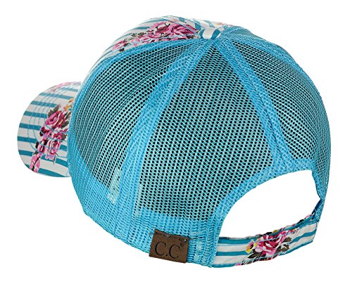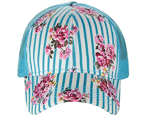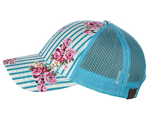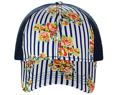 -. Binding : Apparel -. Brand : C.C -. Department : womens -. Feature : Made with 50% polyester, 50% cotton / One size fits most with adjustable hook and loop fastener / Floral pinstripe P.R.Int on seamed front panel / Height: 5.0"; brim: 2.75" / Great for all seasons and provides shade while running quick errands, marathons, enjoying outdoor activities -. Model : BA1010 -. ProductGroup : Apparel -. ProductTypeName : HAT -. Title : C.C Floral and Pinstripe P.R.Int Front Panel Adjustable Mesh Trucker Baseball Cap