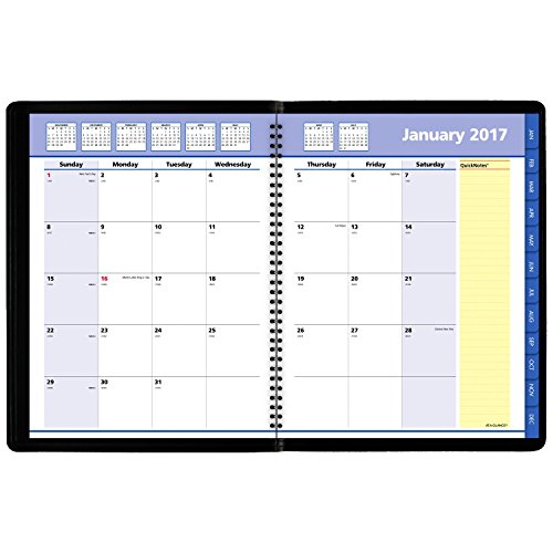 -. Feature : Quick Notes Monthly planner covers 12 months January - December for a year's worth of planning power. Julian dates. One month per two page spread layout with unruled daily blocks provides plenty of room for marking deadlines and planning events / Yellow highlighted Quick Notes writing area and additional 40 Quick Notes pages are where you can conveniently jot down to-do's, meeting notes, contact info and more to stay perfectly organized. Two past and six future months display provide quick reference / Page sizes 8.25 in. x 10.88 in.. Overall size 9.25 in. x 11.38 in. x.25 in. / Storage pocket lets you keep important documents, business cards or flyers at hand. Wirebound black cover to securely keep your important information all together / Telephone and Address page to store important contact information. Pages P.R.Inted in four colors on premium paper containing 30% post-consumer waste that resists ink bleed under normal usage with common writing instruments