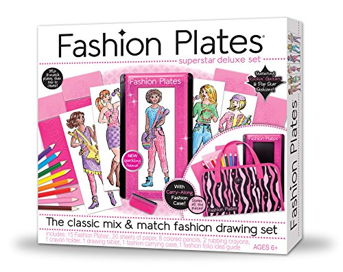 There are endless design possibilities with the Fashion Plates Superstar Deluxe Set! Mix-and-match design plates make it easy for your little fashionistas to make their own style. Then, they just place the sketch paper and pass the rubbing tool over to transfer the design easily. Includes 15 fashion plates, 20 sheets of paper, 8 colored pencils, 2 rubbing crayons, 1 crayon holder, 1 drawing tablet, 1 fashion carrying case and 1 fashion folio idea guide. For ages 6 and up.Feature
