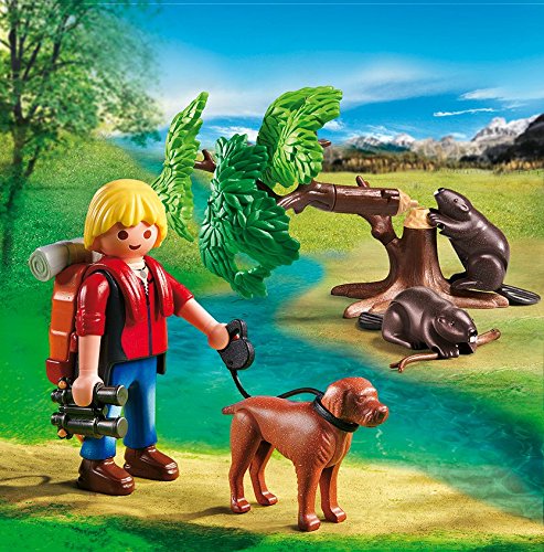 Set includes one figure with backpack and camp roll, dog with leash, two beavers, folding tree, binoculars, and other great accessories