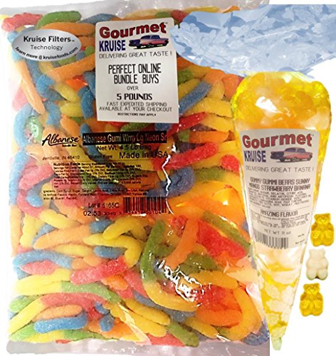 -. Title : Gummi Gummy Sour Worms Albanese - Bulk Candy 4.5Lb Bag With Yellow Mango And White Strawberry Banana Bears Gourmet Kruise Signature Gift Bag 11 OZ (NET WT 83 OZ) 2 Item Bundle