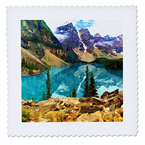 3dRose Lake View with Purple Mountains and Pine Trees Watercolor Scenic Quilt Square, 12 x 12"