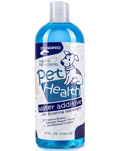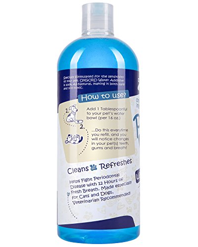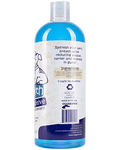 -. Binding : Misc. -. Brand : OxGord -. Department : mens -. EAN : 0840345109408 -. Feature : SAFE AND EFFECTIVE PET WATER ADDITIVE: Easy to use, safe to swallow pet water additive perfect for dogs & cats / FRESHENS BREATH, REDUCES PLAQUE & TARTAR: Peppermint flavored dental care for healthy teeth & gums / ALCOHOL FREE ORGANIC INGREDIENTS: Purified water + organic peppermint & aloe naturally cleans teeth / SIMPLY ADD TO WATER BOWL: Easier than brushing (but not a substitute), pet water additive is added to your pet's water daily / SATISFACTION GUARANTEED: If you're not 100% satisfied with your pet water additive return at any time -. Label : OxGord -. Manufacturer : OxGord -. Model : PTWA-01-32 -. MPN : PTWA-01-32 -. PackageQuantity : 1 -. PartNumber : PTWA-01-32 -. ProductGroup : Pet Products -. ProductTypeName : PET_SUPPLIES -. Publisher : OxGord -. Studio : OxGord -. Title : Pet Dog Breath Freshener Water Additive Mouthwash for Fresh Teeth Cleaning Plaque Tartar Remover Cat Oral Dental Care | New Formula 2017 -. UPC : 840345109408