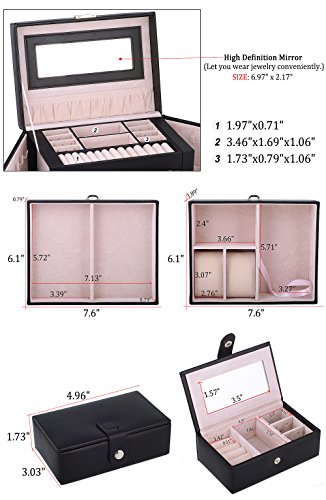 Clean lined, sleek, contemporary designed jewelry box. Sturdy construction. It measures 10.24"L x 7.4"W x 6.89"H when closed. Removable mini travel jewelry box (can be put in bottom drawer) that holds even more rings/necklaces/earrings and other jewelry -- perfect for any trip!