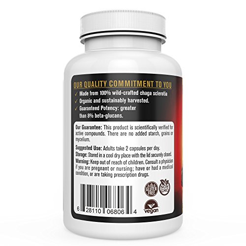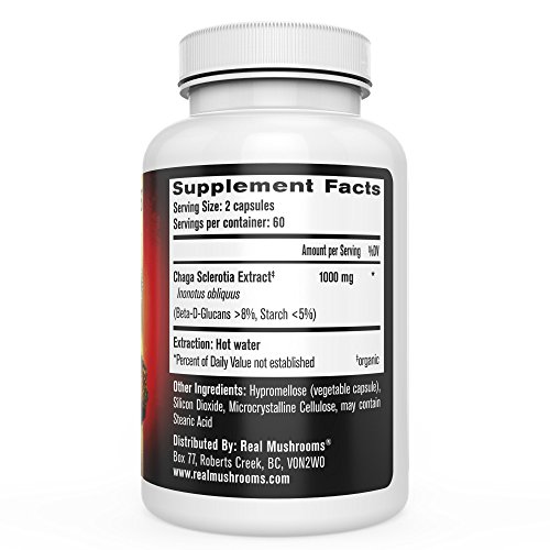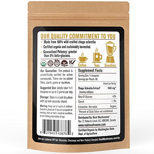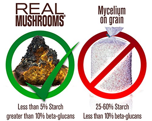 -. Feature : PURE CHAGA SCLEROTIUM EXTRACT POWDER: Made exclusively from 100% organic chaga sclerotia. The Chaga is hand picked from Russia, Siberia and Northern China to make the best extract possible. They are extracted with hot water to break down the cell walls and make the active compounds more bioavailable to us. Hot water extraction give us access to the beneficial beta-glucans and thousands of other nutrients. We do not add any starch, grains, or fillers into our products. Just 100% pure chaga. / SHAKES | SMOOTHIES | COFFEE | TEA: Real Mushrooms Chaga Extract arrives in an easy-to-use airtight, resealable food grade packaging allowing for as much or as little use as you need for any occasion. For an extra health boost, add it into your coffee, tea, healthy green smoothies, post-workout protein shakes, bone broths, soup stocks, as an extra ingredient in your favorite recipes or maybe even an upgrade in your bulletproof coffee. Our extracts are 80-90% soluble in water. / GUARANTEED POTENCY: Real Mushrooms Chaga Extract is guaranteed by analytical testing to have the active, medicinal compounds scientifically shown to boost your immune system. Our extract contains >10% Beta-glucans and <5% Starch. Beta-glucans are one of the main active, most well researched, medicinal compound in chaga. We measure beta-glucans specifically because polysaccharides numbers include starch, so polysaccharide testing can yield a false sense of quality. / 100% SCLEROTIA: Our product undergoes rigorous quality control testing to make them Certified Organic, Certified Kosher, Gluten-Free, Non-GMO, Vegan, Dairy-Free and Nut-Free. We guarantee that there is absolutely no added starch, grains, contaminants or fillers of any kind. We use starch testing to show the purity of our extract powders. / 100% SATISFACTION GUARANTEED: If for some reason, you are not satisfied with our mushroom extract powders we provide a no-hassle no-questions-asked refund. Yes, we are that devoted to your happiness!