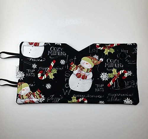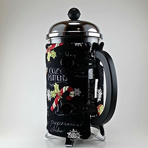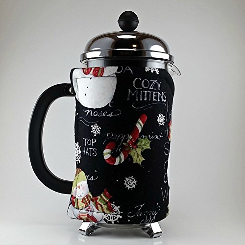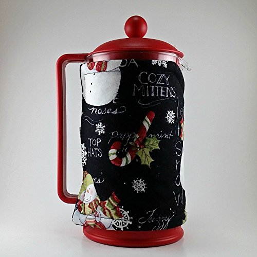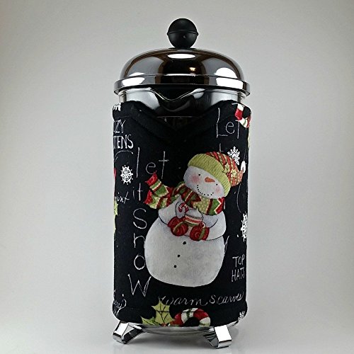 Product Description This snowman themed cozy is going to be perfect for those cold winter days. This is a handmade french press cozy, made to fit an 8 cup press. Made with 100% cotton print, insulated with Insul-Bright and lined with cozy cotton flannel fabric. Two 1/4 inch straps loop easily over two buttons for an easy placement. Top stitching in a coordinating color for a quality finish. 0