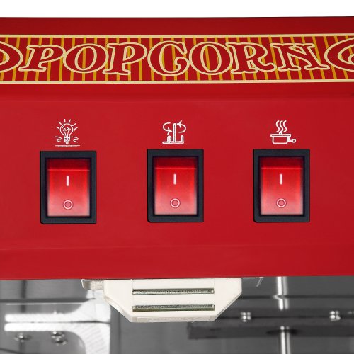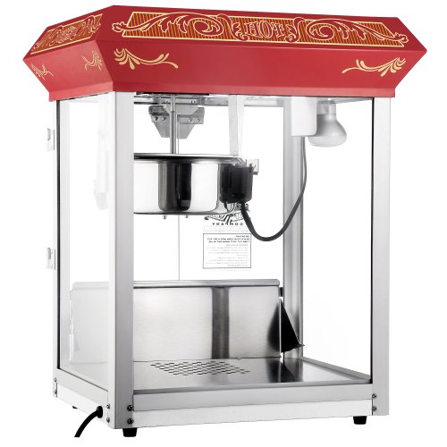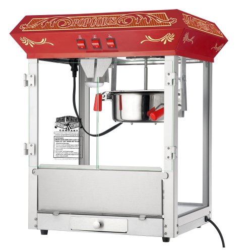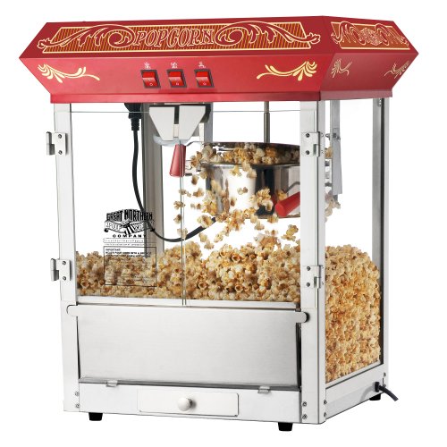 -. Binding : Kitchen -. Brand : Great Northern Popcorn Company -. Color : Red -. EAN : 0610708145929 -. Feature : Deluxe model with 3 control switches instead of 2 switches on lesser machines / Switches include: spot light warmer, stirrer and pot heater; Heated Warming Deck / Built-in warmer light; Popcorn scoop is included; Reject kernel tray Kernel and oil scoop included / Heavy-duty powder coated steel and stainless steel construction; Cleans up with water / Makes roughly 3 gallons of popcorn per batch; Minor assembly is required -. Label : Great Northern Popcorn -. Manufacturer : Great Northern Popcorn -. Model : 6136 Old Time Red Top -. MPN : 6136 Old Time Red Top -. NumberOfItems : 1 -. PackageQuantity : 1 -. PartNumber : 6136 Old Time Red Top -. ProductGroup : Kitchen -. ProductTypeName : KITCHEN -. Publisher : Great Northern Popcorn -. Size : 8-Ounce -. Studio : Great Northern Popcorn -. Title : Great Northern Popcorn Old Time Popcorn Popper Machine Countertop, 8-Ounce, Red -. UPC : 610708145929 -. Warranty : 5 Years Machine / 30 Day on Kettles and light bulbs