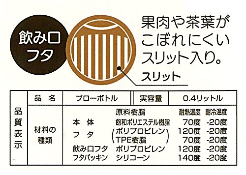 -. Feature : サイズ:直径6.2×高さ18.5cm / 素材・材質:本体=飽和ポリエステル樹脂 フタ=ポリプロピレン、TPE樹脂 飲み口フタ=ポリプロピレン フタパッキン=シリコーン / 生産国:中国 / 容量:400ml