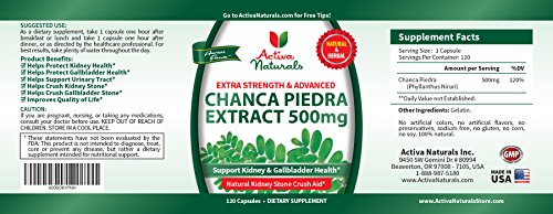 -. Feature : Why Buy Our Chanca Piedra Supplement: A premium herbal supplement blended with 500mg Chanca Piedra Extract formulated to provide right nutrients to support Kidney, Gallbladder & Urinary Bladder Health naturally / Feel the Activa Naturals Difference: Read the product reviews to see how customers are benefitting by taking our Chanca Piedra Health Supplement to support their Kidney, Gallbladder and Bladder health / Key Product Benefits: Provide necessary nutritional support to help maintain health of Kidney & Urinary System through targeted natural & herbal vitamins, minerals and nutrients / Key Product Features: No chemicals, no fillers, no additives, manufactured in the USA, more value for money pricing with 100% peace of mind for the ingredients' purity / Outstanding Customer Support: Buy any of our products confidently as our commitment is to work with you until we find the right solution. You come first to us!