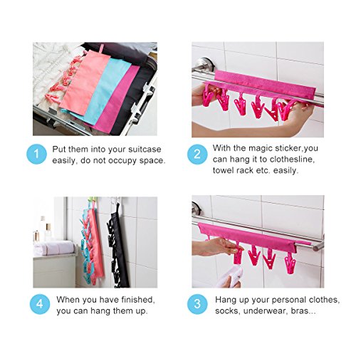 VECKLI Bathroom Cloth Hanger with Clips Travel Portable Folding Clothespins Laundry Drying Clips for socks, bras, underwear, Pack of 4 (Black, Rose Red, Watermelon Red, Blue)