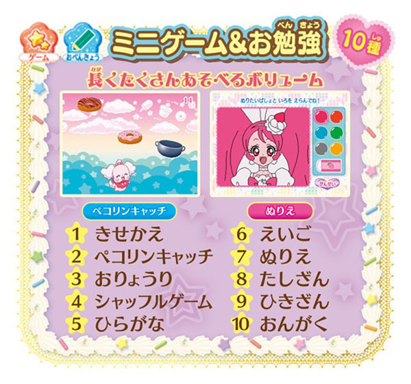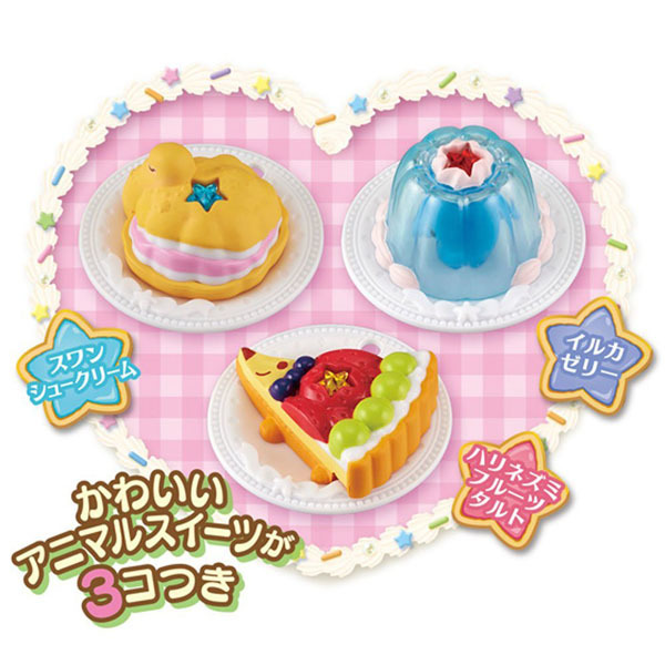 세트 내용:키라 패티  본체 1개 집게 1개 터치  1개 짜기 터치  1개 아와다테기 터치  1개 애니멀 스윗츠 스완 슈크림 1개 돌고래 젤리 1개 고슴도치 후르츠 타르트 1개 사용 배터리: 4×4(별매)