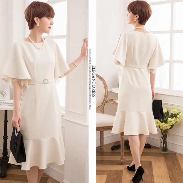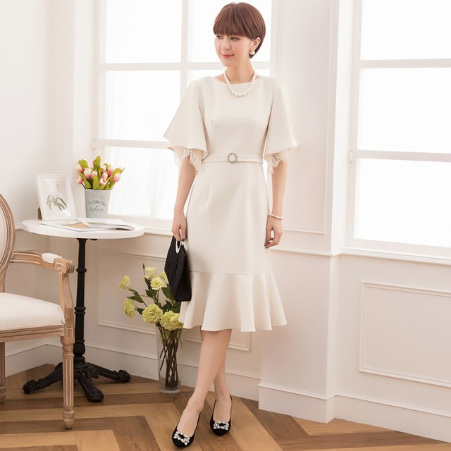 二の腕を隠しながら肌を覗かせて大人シックにお召しいただけます♪ェミニンなマーメイドラインで女性らしい曲線美を引き立たせてくれます。ラインストーン付共布ベルトでウエストマーク、脚長効果抜群です◎