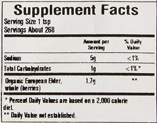 Botanical Name: Sambucus nigra L.Directions: To use as a tea, pour 1 cup boiling water over 1 tsp. of herb, cover and steep 3-5 minutes.Origin: HungaryOrganic: QAI Certified OrganicKosher: KSA CertifiedSupplement FactsServing Size 1 tspServings 268 Amount Per% Daily ServingValueSodium 5mg<1%Total Carbohydrate 1g<1%*Organic Elder, whole (berries) 1.7g*** Percent Daily Values are based on a 2,000 calorie diet. ** Daily Value not established.Common Name: Elder BerriesPlant Part: BerryBar Code: 0-89836-02730-6Feature