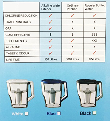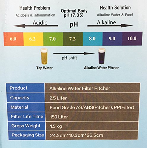 Enjoy The Health Benefits Of Crystal Clear Alkaline Ionized Water This great water pitcher filters your water with a process that removes free radicals, eliminates toxins and increases immunity and energy levels.