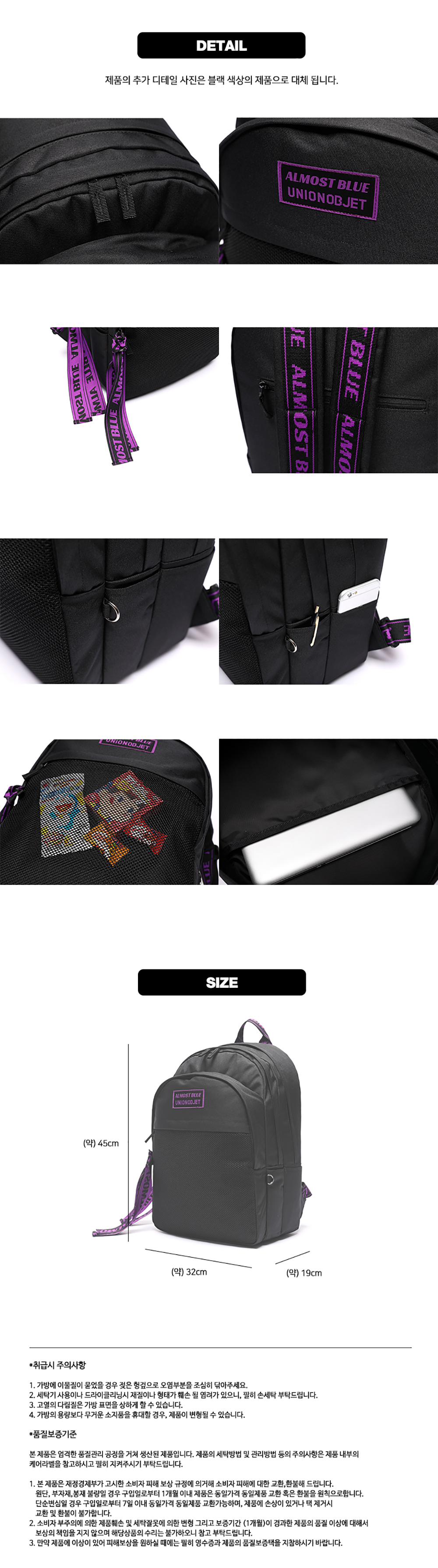| 얼모스트블루와 유니온오브제가 만나 야심차게 준비한 백팩입니다! 오늘 하루 필요한 책들과 노트북까지 거뜬히 들어가는 큰 용량의 메인 포켓 3개와 프라이빗한 물품을 넣을 수 있는 서브포켓 1개, 인형, 과자 등을 넣을 수 있는 망사포켓 1개, 펜이나 핸드폰, 보조배터리를 넣을 수 있는 사이드포켓 4개, usb나 동전지갑을 넣을 수 있는 가방 뒷판 수납부 1개 총 10개라는 넉넉한 수납부를 자랑하는 백팩입니다. 게다가 지갑이나 열쇠고리를 달 수 있는 D링과, 어깨에 통증을 줄여주는 어깨끈 메쉬쿠션까지 넣었어요. 이정도면 완벽한 백팩 아닐까요? |