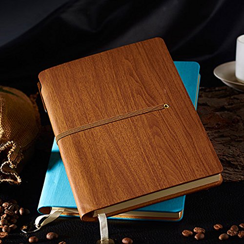 PU Leather Notebook, izBuy Retro Vintage Diary Memo Daily Use Gift for Men/women - 200 Lined Beige Pages, Elastic Band Wood Pattern Cover, Mediterranean Style, Brown, Gel Pen Included (60-25)