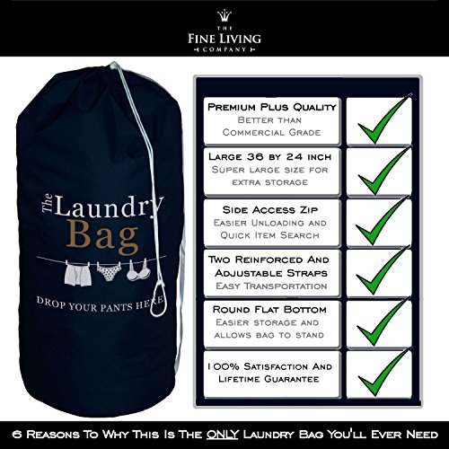 - Better than Commercial Grade material and double stitched for extra strength. - 36 x 24 inches for extra capacity. - Two Reinforced and adjustable straps for easier transportation. - Side zip opening to easier unloading or finding that particular item quickly when needed. - Round and flat bottom that makes it easier for your laundry bag to stand. - Perfect for college and travelling. - Perfect for men and women - Go to the laundromat with ease and comfort