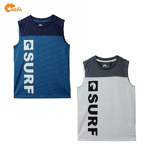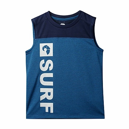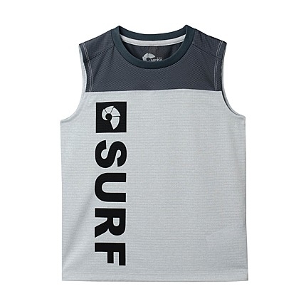 - 메쉬소재가 믹스된 민소매 티셔츠 - 서프 모티브 프린트가 크게 들어간 그래픽을 강조한 디자인 - 뒷넥에 형광 웰딩 포인트