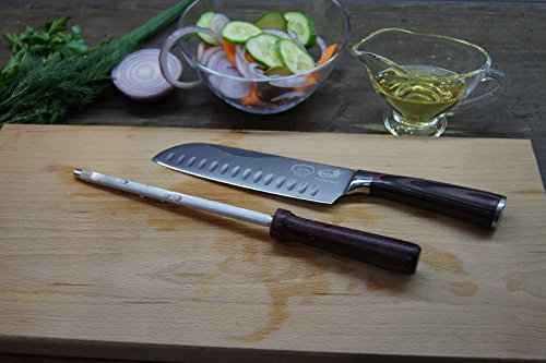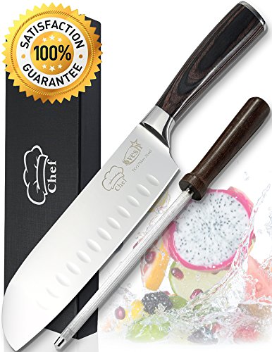An Ultimate Santoku Chef Knife with Sharpener in the Gift Box. A High Quality Knife is made of high-carbon stainless steel , wear-resistant, durable, rust-proof and stain resistant. Professional blade with satin finish has sharpening for long-term sharpness. The knife is durable and ideal balanced.