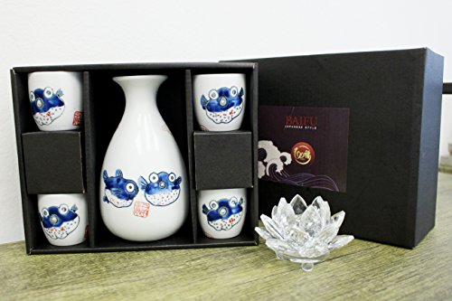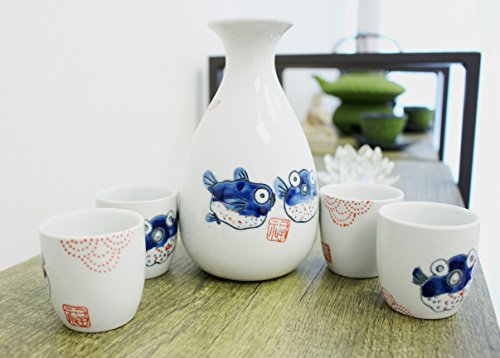 (BaiFu)/Kitchen Dining/Tableware/DIRECT FROM USA/Traditional Porcelain Puffer Fish Sake Set 4 Cups 1 Decanter / Carafe / Sake Set / House warmin...