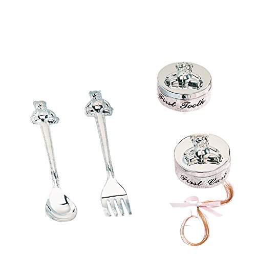 4 Piece silver-plated gift set includes teddy-bear embellished box to hold baby's first lost tooth, a box to save a lock of hair and a child-size fork and spoon