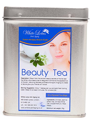-. Binding : Misc. -. Brand : White Lotus Anti Aging -. EAN : 5060268260689 -. Feature : NATURAL : This Premium blend of beauty tea has been designed by International Anti Aging Experts in their FAMOUS ANTI AGING CLINIC . It is 100% Natural and it tastes divine. Each tea has been handpicked for it's P.R.Ized anti aging abilities. / TRADITIONAL: Inspired by the secrets of the Far East.Only the finest traditional Jasmine Green and White tea have been selected. Along with Rose Petals and Chrysanthm Flowers- traditionally used in ancient China to beautify the skin's appearance by the affluent. / AIDS Beauty: This brilliant tea has been created to enhance the appearance of the skin. The beauty tea reduces redness, puffiness and signs of aging. The ingredients contain some of the most potent antioxidants available naturally. / FRESH: Provided in a metal tin and plastic vacuum packed for freshness. Only whole leaves and flowers are used, so that the tea is truly beneficial for you. The pyramid tea bag also allows you to view the quality of the ingredients and does not contain left over 'dregs', like conventional tea bags. This is why it tastes so fragrant! / CONVENIENT: 15 Pyramid shaped tea bags ensures the whole tea leaf is used and infusion is more effective. One Tea bag goes a long way and can be used to make a pot of tea, to be enjoyed throughout the day . Alternatively 1 Tea bag makes 3 cups of tea. -. Label : White Lotus Anti Aging -. Manufacturer : White Lotus Anti Aging -. MPN : PR82 -. PartNumber : PR82 -. ProductGroup : Beauty -. ProductTypeName : BEAUTY -. Publisher : White Lotus Anti Aging -. Studio : White Lotus Anti Aging -. Title : White Lotus Anti Aging-Beauty Tea- For Beautiful Skin- Premium quality-Pyramid Tea Bags- Air Tight Tin- BY Famous ANTI AGING EXPERTS