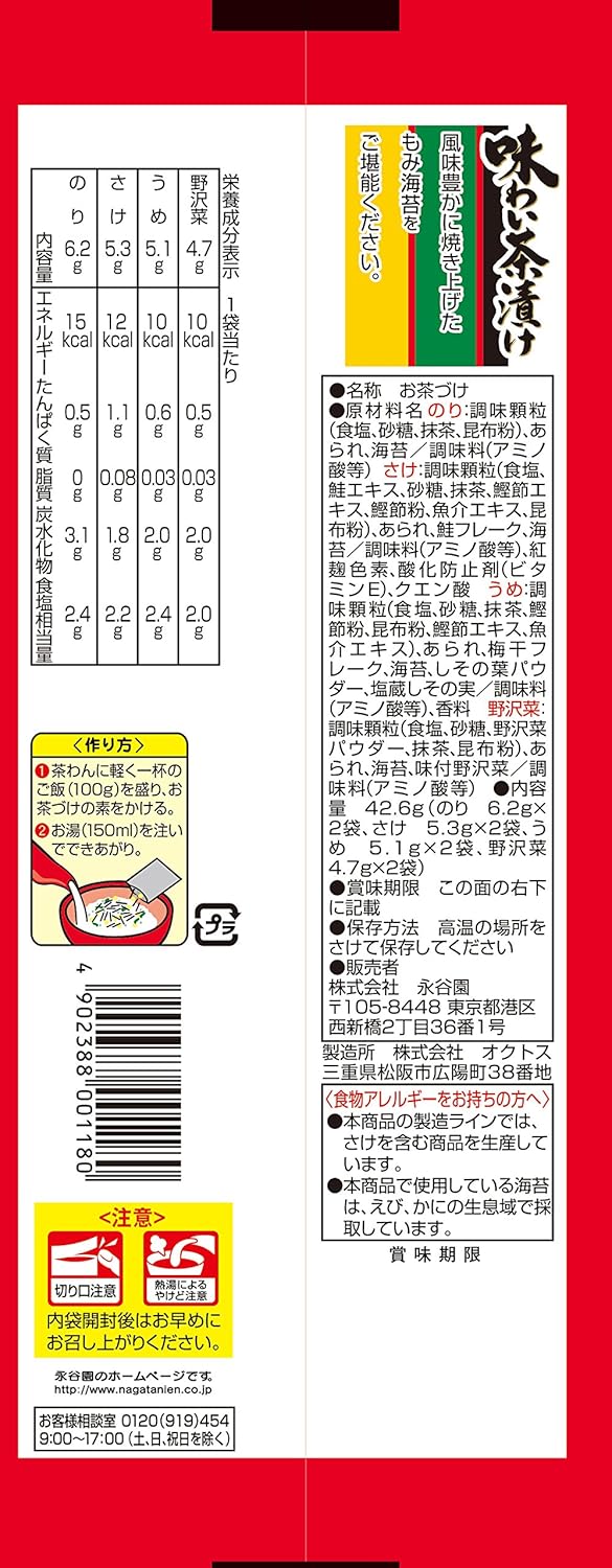 原材料:●のり:調味顆粒(食塩、砂糖、抹茶、昆布粉)、あられ、海苔、調味料(アミノ酸等) ●さけ:調味顆粒(食塩、鮭エキス、砂糖、抹茶、鰹節エキス、鰹節粉、魚介エキス、昆布粉)、あられ、鮭フレーク、海苔、調味料(アミノ酸等)、紅麹色素、酸化防止剤(ビタミンE)、クエン酸 ●うめ:調味顆粒(食塩、砂糖、抹茶、鰹節粉、昆布粉、鰹節エキス、魚介エキス)、あられ、梅干フレーク、海苔、塩蔵しその葉、塩蔵しその実、調味料(アミノ酸等)、香料 ●野沢菜:調味顆粒(食塩、砂糖、野沢菜パウダー、抹茶、昆布粉)、あられ、海苔、乾燥野沢菜、調味料(アミノ酸等)