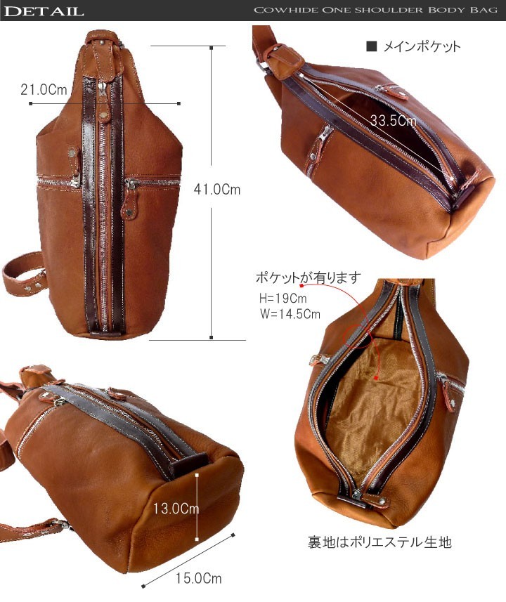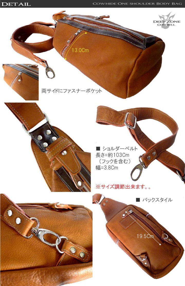 Deep Zone ワイルドでセクシーを上品にまとめる男のレザーブランド。 自分買いからプレゼントにも人気でオススメです。一流革職人がハンドメイドで仕上げられた、 本革 レザー ボディバッグ、ワンショルダーバッグ【素材】 牛革 金具:合金製 【サイズ】高さ:約41.0cm 幅:約21.0cm 【カラー】ブラウン・ブラックキメの細かい肌触りの良い牛革を使用して、手作り感溢れるハンドメイドレザーボディバッグ。前面にメインのファスナーポケットが有りその両サイドにファスナーポケットが有ります.普段持ち歩く財布、スマートフォン、車のキーや手帳、等の小物をスタイリッシュに持ち運びできます。申し分のない収納力と機能性に優れたレザーボディバッグショルダーベルトは長さ調整は可能。またアタッチメントで左右お好みのほうに取り付け可能です。シンプルマインドに可愛さと大人の高級感を表現してます。本革 メンズ レザー ボディバッグ ワンショルダーバッグ 男女兼用