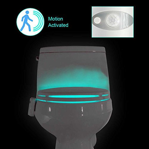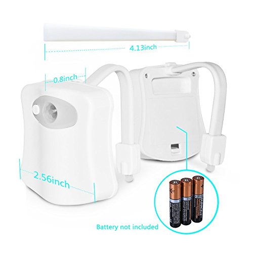 Features: --Special toilet night light equipped with Auto-sensing system, turns on when you approach the toilet in dark, and turns off after 2 mins after you leave, convenient and energy saving. --Personalized modes with 8 different colors. Choose color-rotate and single-color as you wish. Each color for 15 seconds randomly, you can also fix one color you desire. --Emitting soft light in order not to disturb others in the night, more comfortable for your eyes. Lead your way safely and softly in the night. --With flexible rods, freely adjust it to suit the size of your toilet. Specifications: Material: ABS Plastic Voltage:4.5 volts Wattage:0.5 watts Light Source: LED Power Supply: 3x AAA Batteries (Not Includes) Feature: Motion sensor LED Toilet Bowl Light Sense Distance: 2-3 meters Sets to color-rotate (8 colors in 120 secs) Light Color: 8-color(red, orange, blue, green, blue, purple, pink, white)Feature