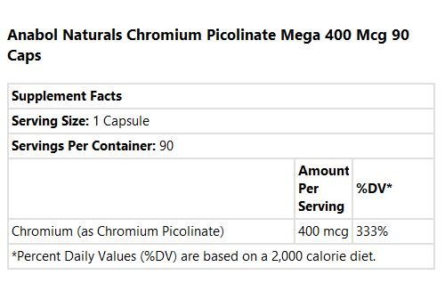 Chromium Picolinate Mega 400 mcg 90 CapsuleHPLC TestedA. Naturals Chromega 400 contains 400 mcg of elemental Chromium from 3.2 mg (3,200 mcg) of Chromium Tripcolinate.