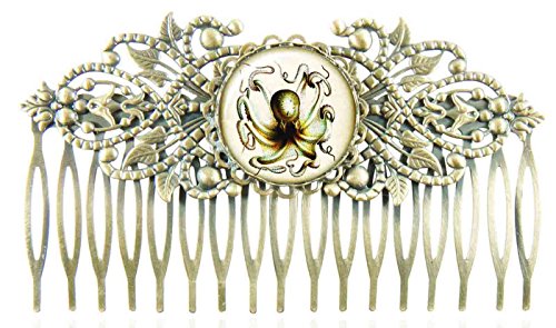 -. Title : Filigree hair comb with glass cabochons protecting a design with an octopus or squid