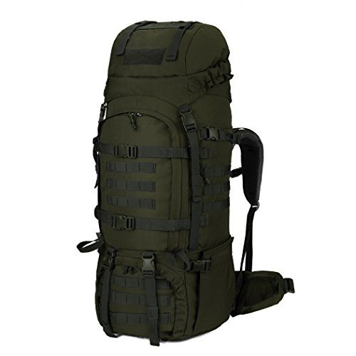 MATERIAL- 65+10L, 11.4"*7.1"*35.4". This tactical backpack is made of Water-resistant 600D polyester. YKK Zipper. Rain Cover Included.