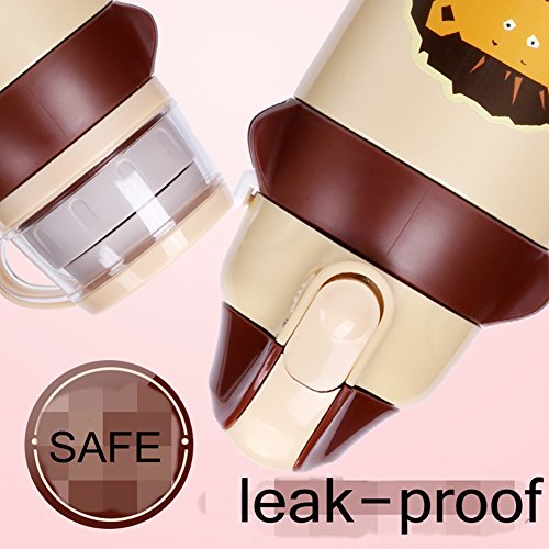 4.Equipped with 2 kinds of lid. A:With a straw, baby can direct drinking water. B:Combination lid, The inner cap is used seal ring, which security leak-proof.It can be taken apart for easy cleaning. Leaking Proof Design:Labeled with a open and close pouring button to ensure no leaks even this thermos water bottle was turned upside down.