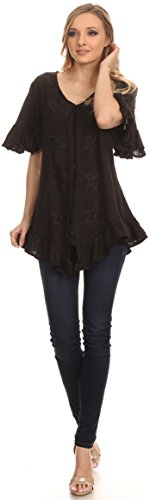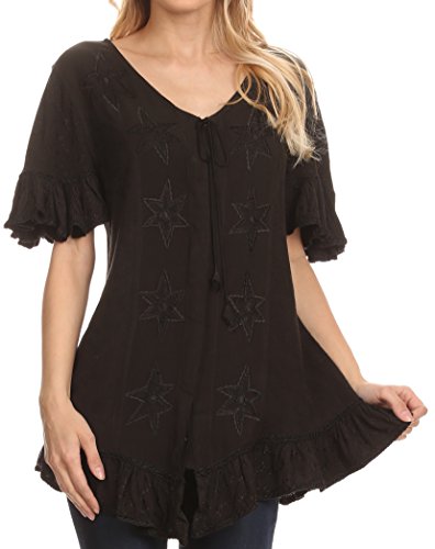 -. Feature : S/M: [(Fits Approximate Dress Size: US 0-8, EU 34-40, UK 6-12) Max bust size: 36 inches (91.4cm), Length: 29 inches (73.6cm)]. L/XL: [(Fits Approximate Dress Size: US 0-12, EU 34-44, UK 6-39) Max bust size: 40 inches (101.6cm), Length: 30 inches (76.2cm)]. / 1X/2X: [(Fits Approximate Dress Size: US 10-16, EU 42-48, UK 14-20) Max bust size: 44 inches (111.7cm), Length: 31 inches (78.7cm)]. / This blouse has beautiful star embroidery designs, and a button down front with a tie neck that is not adjustable but can be tied or left undone per style. The sleeves are long short sleeves with a lot of drape and ruffles at the hem. The bottom hem of the top also has ruffles at the hem. This blouse also has back straps that can tie and be adjusted for a custom fit as desired. / You can wear this top with anything from denim, pants, or a skirt! Just throw on or over beachwear as a coverup and to create an effortless look and feel. Pair with your favorite bot, and pair of shoes and you're ready to go! / Hand wash separately in cold water. Line dry. Imported. | Material: 65% Cotton, 35% Rayon.