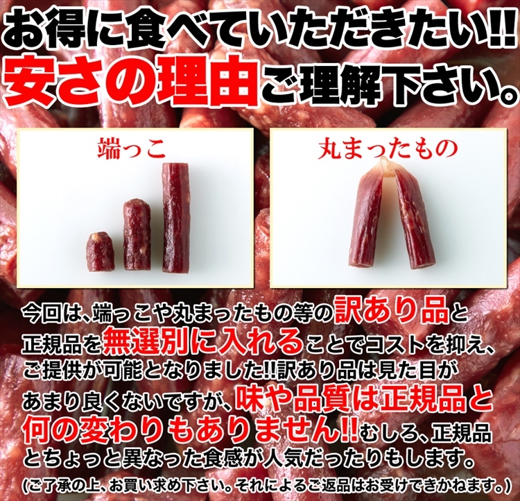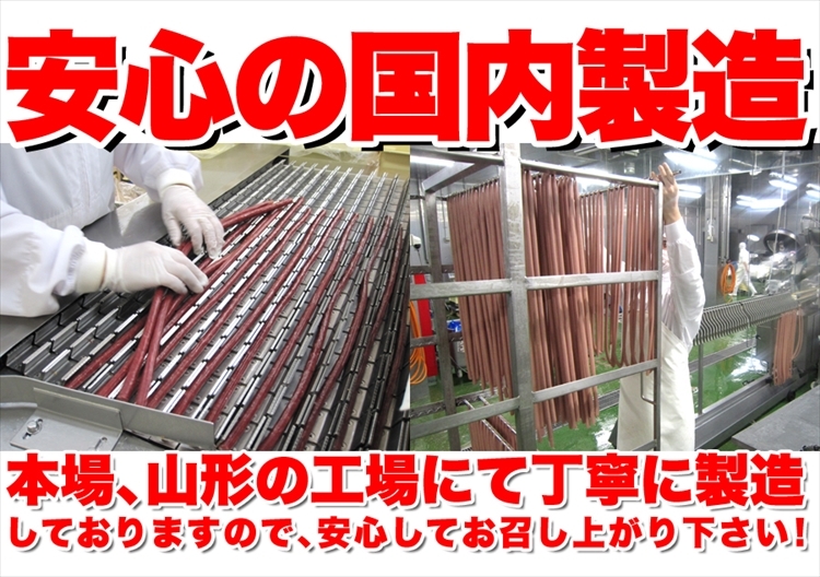 ■原材料名:鶏肉、豚脂肪、豚肉、粉末水あめ、香辛料、食塩、ポークエキス、調味料(アミノ酸等)、リン酸塩(Na)、酸化防止剤(ビタミンC)、発色剤(硝酸K、亜硝酸Na)、(原材料の一部に牛肉、大豆を含む)