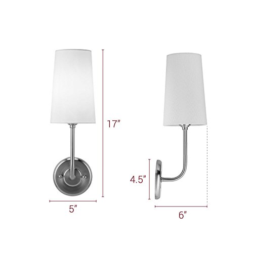 - DIMENSIONS - 17" high x 5" wide, extends 6" from the wall. Backplate is 4.5" in diameter. Features a 8" high x 5" diameter white fabric shade