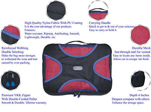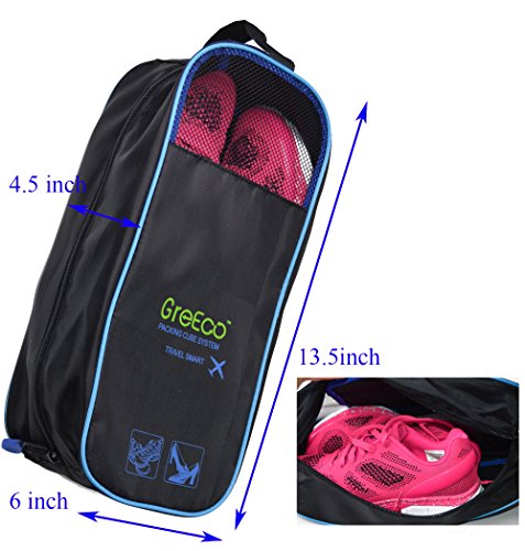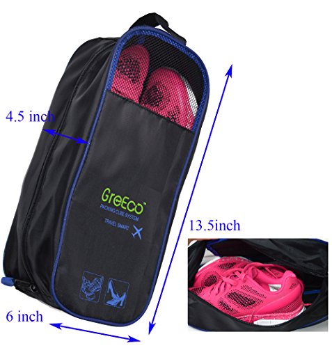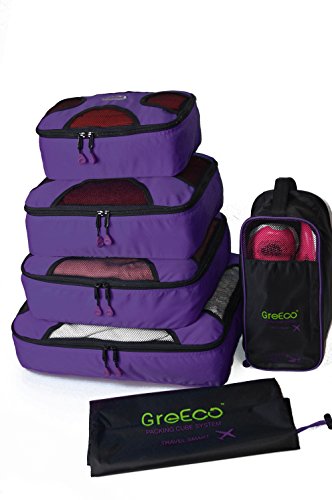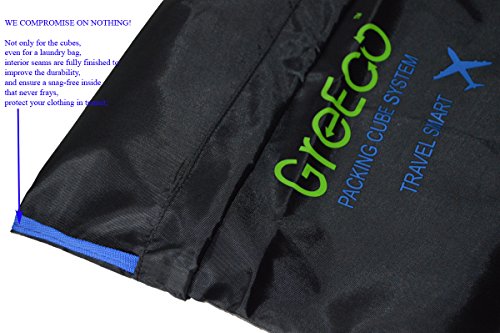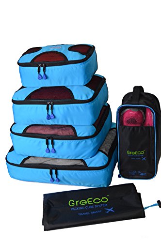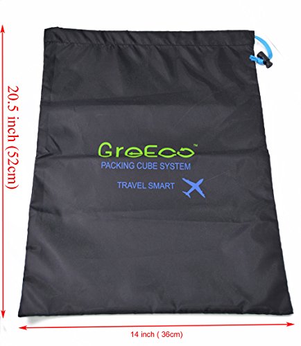 Product Description THANK YOU FOR YOUR VISITING! You can be certain we put a lot of thinking into GreEco Packing Cube System before launch it. Like lots of market research, quality materials comparision, reinforced designed,testing in lab etc. To make a perfect travel for you, additonal laundry bag and shoe bag included. So you can feel our good faith from what you buy! It is designed to be versatile. * These sturdy packing cubes can be used for travel, household organization, or any other storage need you can find! * GreEco laundry bag is rip tear resistant.It has locking drawstring closure and is machine washable.It help separate dirty clothes at the end of the trip. * GreEco Shoes Bag is designed to be waterproof in one side to seperate the moist.Top panel see-through mesh in another side allows for better circulation.It can be store in carry on or check in luggage, duffel bags, be hung on your backpack when you are hiking, camping or gym. Quality features: * Made from high quality smooth nylon fabric, it is water rip resistant to withstand the wear and tear of traveling; * Premium YKK zippers, features smooth and sturdy, with corded double zipper pulls for a lifetime of opening and closing; * Interior seams are fully finished to improve the durability and ensure a snag-free inside that never frays, protect your clothing in transit; * It is reinforced with a "X" Design web stitching made specifically to prevent the fabric from folding in the middle, allowing for a more secure packing experience; * Open mesh design makes it easy to locate items - No more hectic searching for misplaced items. GreEco knows everything's right where you want it to be. With 101 uses, what are you waiting for? *(1)X Large:17.5"x12.75"x4" *(1)Large:13.75"x12.75"x4" *(1)Medium:13.75"x9.75"x4" *(1)Small:11"x6.75"x4" *(1)Laundry Bag:20.5"x14.5" *(1)Shoe Bag:13.2"x4.7"x5.5" 0