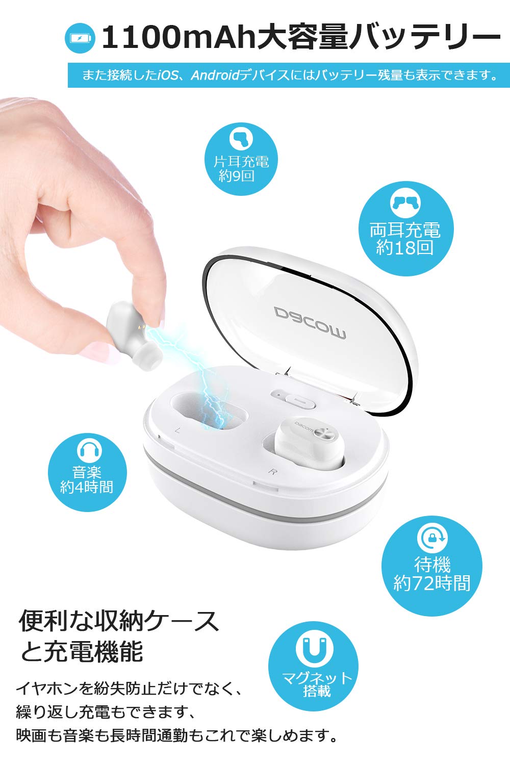 ✔【72時間使えるバッテリーのパワー】ワイヤレスイヤホン本体のバッテリーは音量によって6-7時間使用可能です。使い終わる後充電ケースに収納して電源ボタンを押せば、自動的に充電が行われます。満充電後もスマートに充電停止になるので安心。1100mAhの充電収納ケースが9回両耳イヤホンを満充電できて、ほかのコードレスイヤホンのように毎日ケーブルで充電しなくて済むのです。出張の多い者や自由主義者などにぜひオススメ。