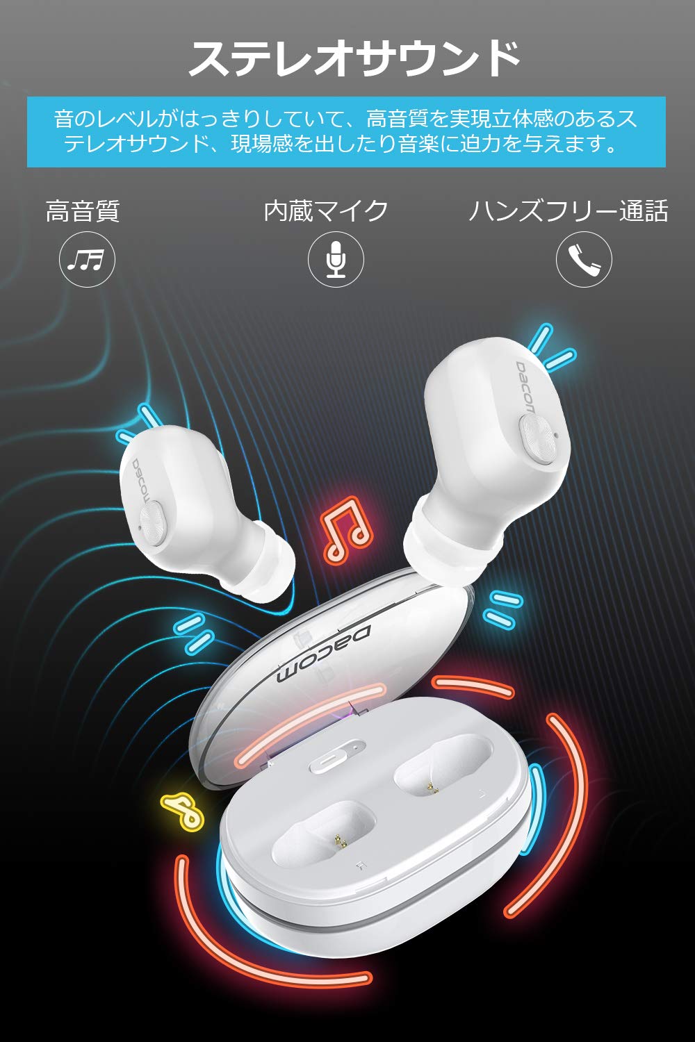 ✔【ステレオ音質&左右分離型】最新チップを採用して、どの音域でもバランス良くクリアで高品質なサウンドを楽しめます。音楽や映画などの様々なサウンドを、本格的な響きであなたの耳に届けます。また左右分離のデザインで、片耳でも両耳でも、使い勝手、他人と別々使用も可能、伝統的なイヤホンの固い使用感覚から完全に解放。【片耳】ドライブ、ウォーキング、デスクワーク、作業中、電話会議、様々なシーンで使用可能。【両耳】ケーブルが邪魔になることもありません、恋人や友達と一緒に音楽を楽しめます。★注意点:両耳使用する場合、電話を出る時、片耳だけ音を出るので、ご注意ください。