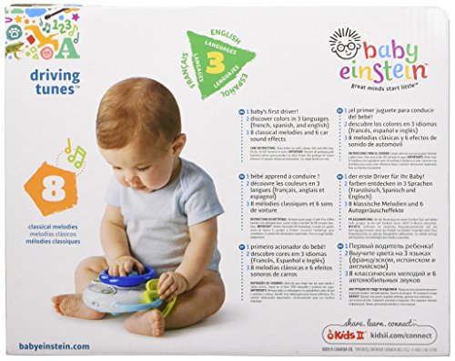 Put baby in the driver's seat for discovery and fun with this engaging steering wheel. The Baby Einstein Driving Tunes features 8 classical melodies and fun car sounds which will keep baby engaged. Baby will be introduced to number and color discovery in 3 languages (French, Spanish, and English). Press the colorful buttons to activate classical melodies and color and number discovery in 3 languages; press the car "horn" for car sounds and classical melodies. This dynamic toy encourages motor skill development while keeping baby smiling. Babies will love their first driver.Feature
