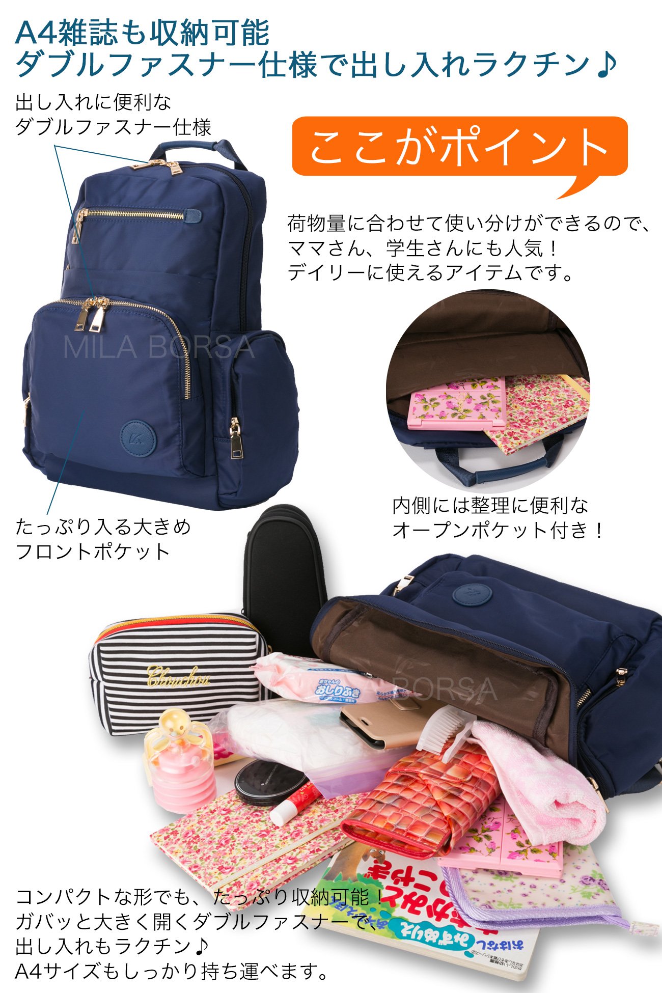 A4 storage magazine is also easy to store ♪ The main pocket is also out and put in and out with a double zipper ♪ In addition to rucksack storage pockets on the outside of the backpack, reasons for popular reasons for convenient storage power and functionality are ♪