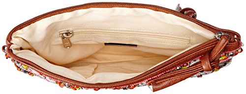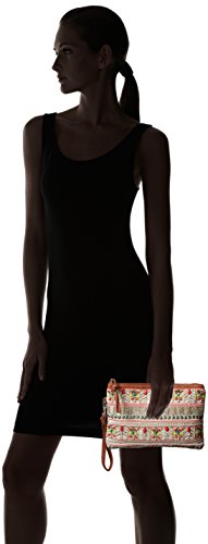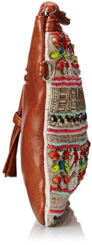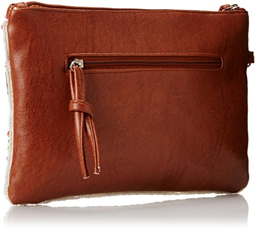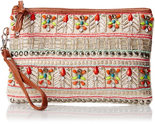 -. Feature : Beaded clutch with faux-leather trim and removable wristlet strap / One interior zip and two slip pockets