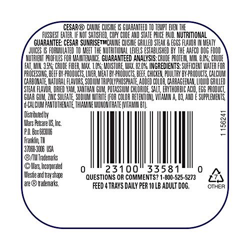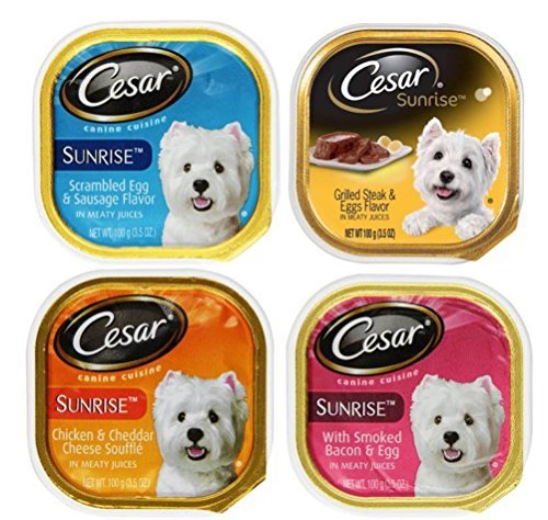 -. Title : Cesar Sunrise Dog Food 4 Flavor 8 Can Bundle: (2) Scrambled Egg & Sausage, (2) Grilled Steak & Eggs, (2) Chicken & Cheddar Cheese Souffle, & (2) Smoked Bacon & Egg, 3.5 Oz. Ea.