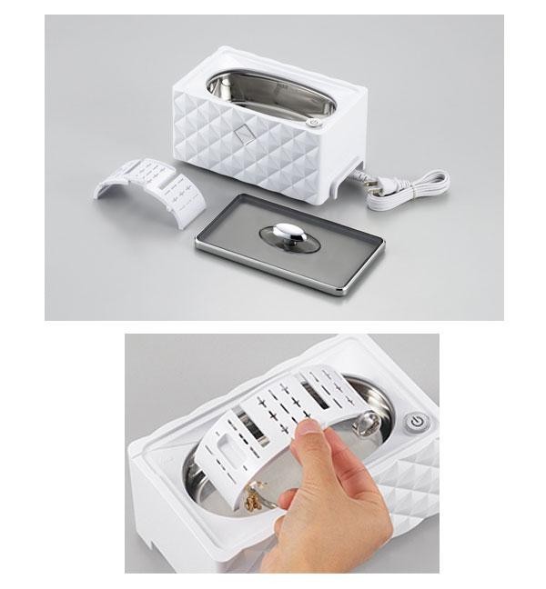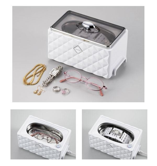 エレガントで日常に溶け込むダイヤカットのデザイン。超音波が細かなスキマの汚れもすっきりと洗浄。ブラシでは届かない細かな部分や隠れた部分まで洗浄。時計やブレスレットなどを固定できるホルダー付。3分で自動停止します。 |