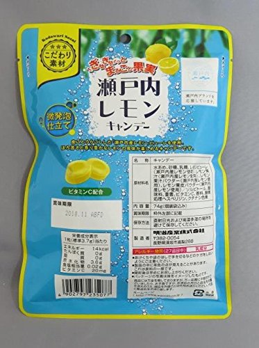 原材料:水あめ、砂糖、乳糖、レモン果汁(瀬戸内レモン使用)、レモン果汁パウダー(瀬戸内産レモン使用)、レモンピューレ(瀬戸内産レモン使用)、レモン果皮粉末(瀬戸内産レモン使用)、ソルビトール、酸味料、重曹、ビタミンC、香料、酵素処理ヘスペリジン、クチナシ色素