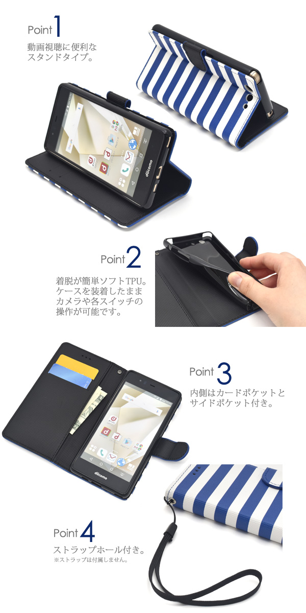 注意※本製品はマグネットを使用しておりますのでクレジットカードなどの磁気カードの収納は避け、カードの注意事項をよくご確認の上ご使用ください。 読み取り等ができなくなる恐れがあります。 ※本製品に収納された、カードのデータ等が喪失された場合におきましても、 当社では一切保証致しかねます。 ※長時間接触していたり、強い力で擦れるとスマートフォンに色移りする場合がございます。 ※本製品をスマートフォンに装着する際には本体や本製品に付着したゴミやホコリをよく取り除いてください。 ホコリ等がついたまま装着すると、スマートフォンに傷がつく恐れがあります。 ※ 本製品は強い衝撃からスマートフォンを保護することは出来ません。