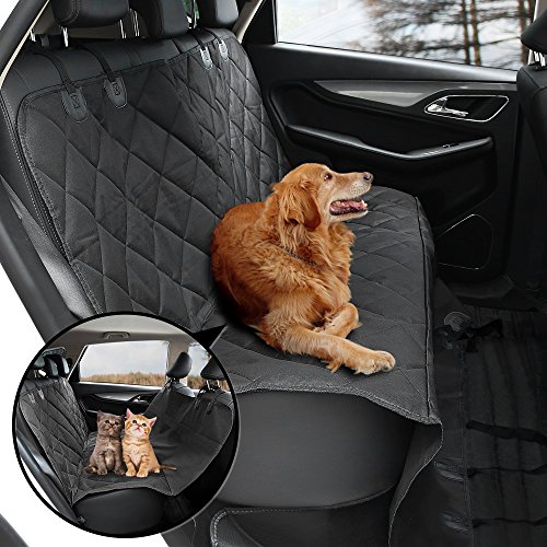 -. Feature : Waterproof & Scratches-proof : Made by high quilted four layer reinforced ,the top layer is durable and waterproof 600D oxford + cotton padded+ anti-slip 210D net backing which makes your dog stay comfortably in place at your car and prevent dirt and hair to keep your seats clean / Easy Install and Remove :The front cover have 2 quick release seat anchor buckles, one for headrest and one for backrest ,The back cover have 4 quick-release buckles and non-slip seat anchors can fix more firmly; (snap the buckle around your headrest and backrest ,then stuff the back seat anchors in the bench seat slots to fix the cover) / Back Seat-Hammock Convertible :18*22 inch (front seat cover );54*57 inch (back seat cover). Rubber nonslip net backing, which can better protect your pets when used as a car back bench seat or pet hammock , also the enhanced headrest straps can help protecting your pets from falling off the seat when you brake suddenly / Universal Fit-size : Designed for front and back passanger seats on all standard vehicles, trucks & SUVs ;padding soft cotton layer and durable PVC material to provide best quality seat cover for your car and your pets ,which also can provide enough thick resistance against paws / Easy Clean : The high quality heavy-duty waterproof polyester can easy to clean with a damp cloth or machine-washed .Allows you and your pet to travel safely together while protect your car back seat from all stains and mud to make drive more relaxing for you