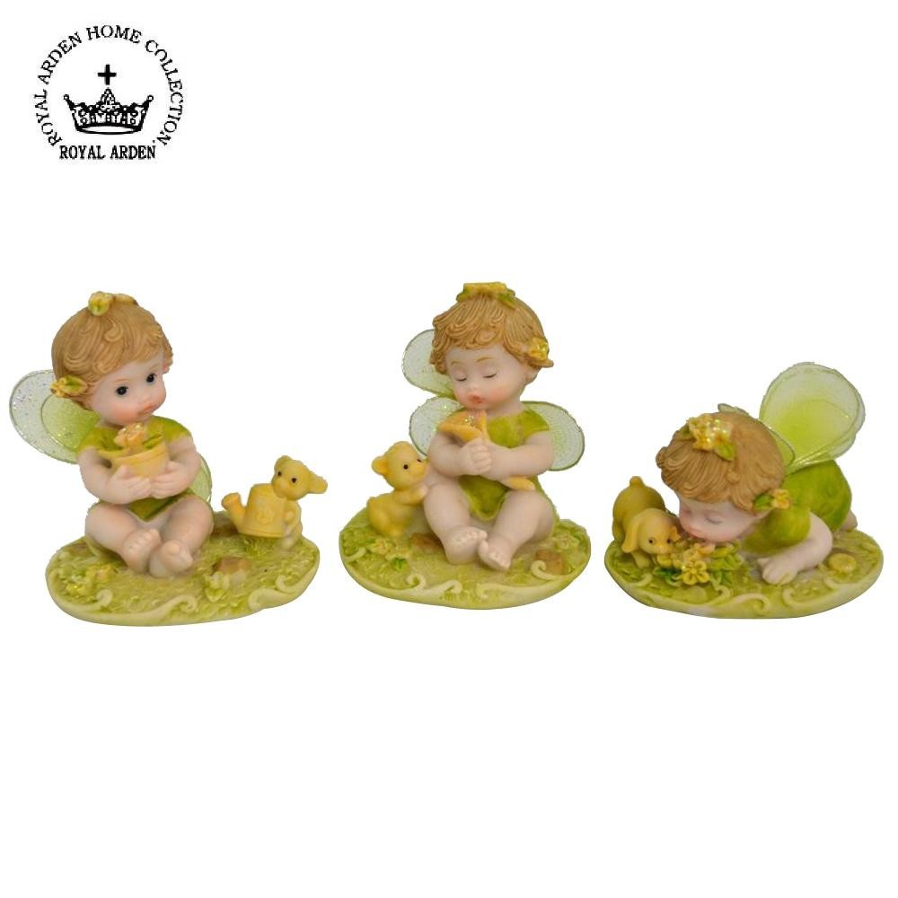 愛らしい表情としぐさがキュートなベビーフェアリーたち。お部屋に飾ると癒されます♪ 製造国:中国 素材・材質:樹脂 商品サイズ:W8×D6×H5~7cm ※サプライヤー直送品 ご注文後5~6営業日後の出荷となります【商品名】ロイヤルアーデン オブジェ フェアリー 3Pセット グリーン 64195