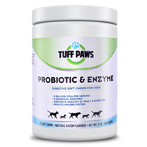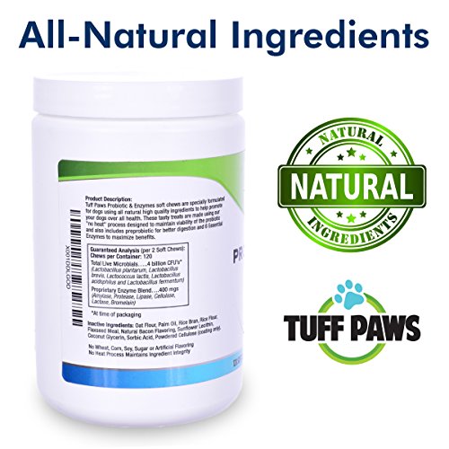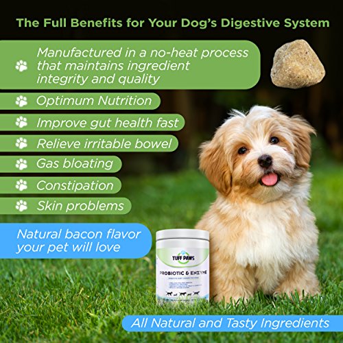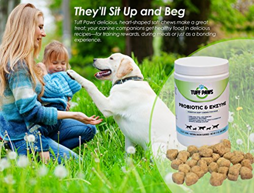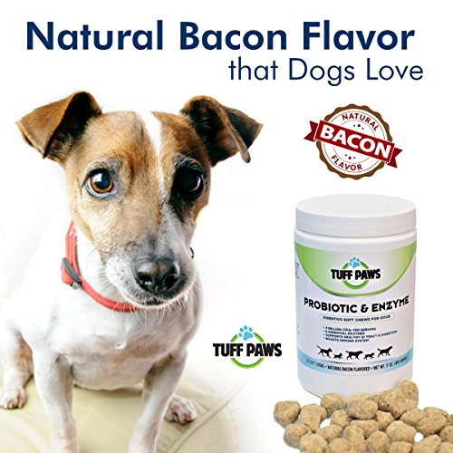 Tuff Paws' delicious, heart-shaped, bacon flavored soft chews are so good, they'll sit up and beg. Doggie delicacies make a great treat; your canine companions get healthy food in delicious recipes for training rewards, during meals or just as a bonding experience. Dogs' GI tracts are very sensitive, even small day to day stresses (such as a road trip or change in their routine) can cause an upset stomach. Natural nutrition supplements improve gut health fast. Keep your dog regular. Their everyday health requires regular doses of quality, essential probiotics so give your pet optimum nutrition with probiotic-enzyme soft chews for dogs. These all natural, tasty ingredients blended without soy, dairy, wheat gluten, corn, sugar, salt or gumming agents. Manufacturing chews in a no-heat process maintains ingredient integrity and quality-your dogs receive the full benefit for their digestive systems. Probiotics offer relief from irritable bowel, gas bloating, constipation, loose stools, skin problems, coat problems or bad dog breath which happen without enough good bacteria in the gut. Spoil your 4-legged friend with a natural bacon flavor that your pet will love.Feature
